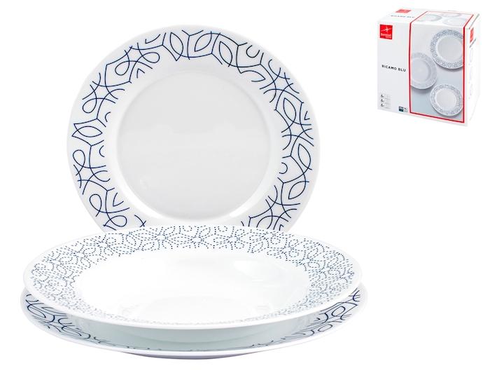 Servizio 18 piatti toledo in vetro opale decoro blu. composto da 6 piatti piani cm 25,6 piatti fondi cm 24 e 6 piatti frutta cm 20