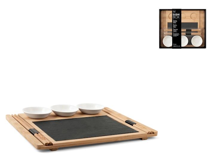 Confezione 9 pezzi sushi box in ardesia e bambu’ cm 24×29. Composto da: 1 vassoio in bambu’ cm 29×24,5, 1 piatto in ardesia cm 20×15, 3 coppette in porcellana cm 7×2, 2 paia di bacchette in bambu’ cm 24. Coppette adatte al microonde e lavastoviglie